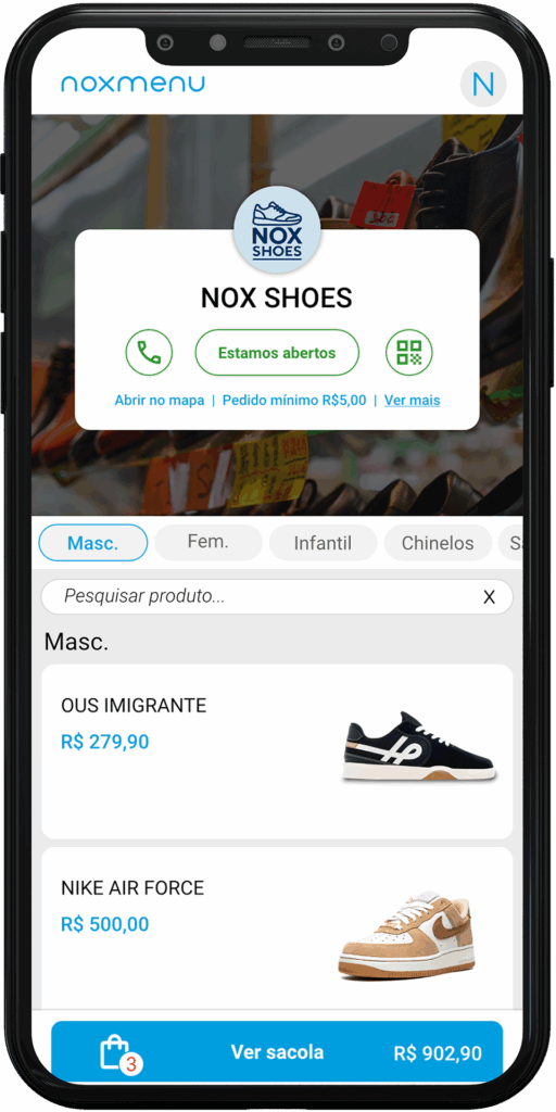 Transforme sua vitrine em um catálogo online profissional: fotos, preço e disponibilidade em tempo real, com pedidos por região e integração ao PDV NoxMob Varejo.