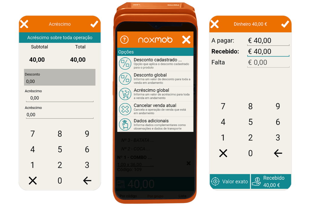 Os meios de pagamento integrados do NoxMob Fácil garantem que cada venda chegue à maquininha com o valor correto. Em poucos toques, você recebe por cartão ou PIX sem precisar redigitar valores ou alternar entre sistemas.